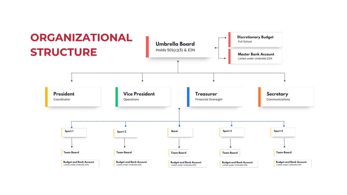 An umbrella booster club board brings all of a school’s individual team and program boosters under one centralized, 501(c)(3) organization. This structure streamlines fundraising, enforces consistent financial oversight, and allows each program to have parent representatives while the main board handles compliance, governance, and shared resources.